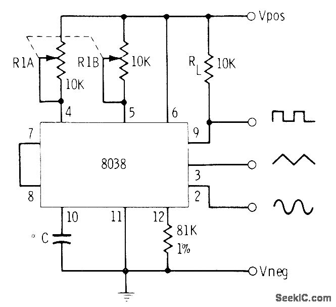 Ganged 10K dual pot covers range when C is 0.25 μF for 8038CC waveform generator. Other values of C (from 0.005,μF to 2.2 μF) give different frequency langes between 10 Hz and 50 kHz. Linearity of waveforms depends on tracking precision of dual pot.-C. D. Rakes, Integrated Circuit Projects, Howard W. Sams, lndianapolis, IN, 1975, p 116-120.