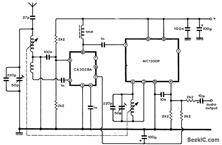 Circuit uses ICs to provide product demodulator that overcomes interstation tuning whistles or heterodynes by deriving local oscillator source from incoming signal carrier. This AM carrier is amplified before modulation is stripped off, and used in homodyne system in which convener output (IF signal) is the same as audio signal. Motorola MC1330P IC, originally developed as color TV video detector, is here connected as synchronous demodulator. RF amplifier IC is RCA CA3028A operating in cascode mode, with permeability tuning of input and RF choke and input of MC1330P together forming output load. Article covers circuit operation in detail and gives alignment procedures. Although developed for broadcast band, basic circuit can be adapted for communication and FM receivers as well.-J. W. Herbert, A Homodyne Receiver, Wireless World, Sept. 1973, p 416-419.