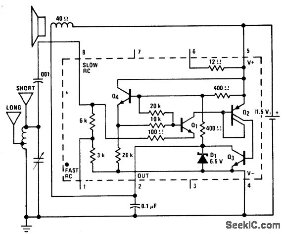 AM broadcast receiver using an LM3909 chip. The LM3909 acts as a detector amplifier. It does not oscillate because there is no positive feedback. The receiver is only good for local stations and sensitivity is similar to a crystal set. It will drive a 6-inch loudspeaker. The antenna can be the short version shown, which is 10 to 20 feet long, or the long version, which is 30 to 100 feet. The long one works better (courtesy National Semiconductor Corporation).