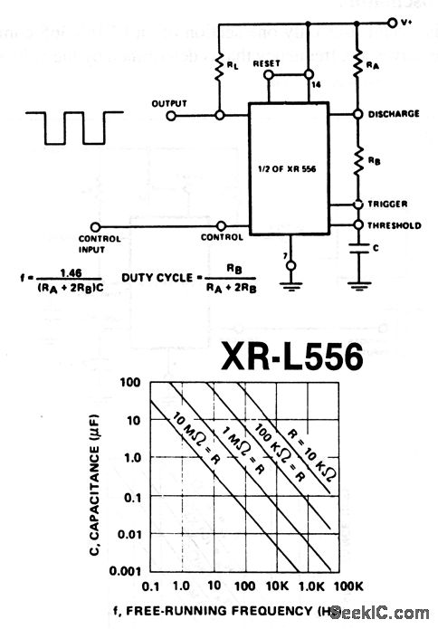 This circuit uses one section of an XR-L556 dual timer. Output frequency and duty cycle are set by C and R (Fig. 5-12B). Notice that R=RA + 2RB (Fig. 5-12B). EXAR Corporaton Databook, 1990, p. 5-218/5-221.