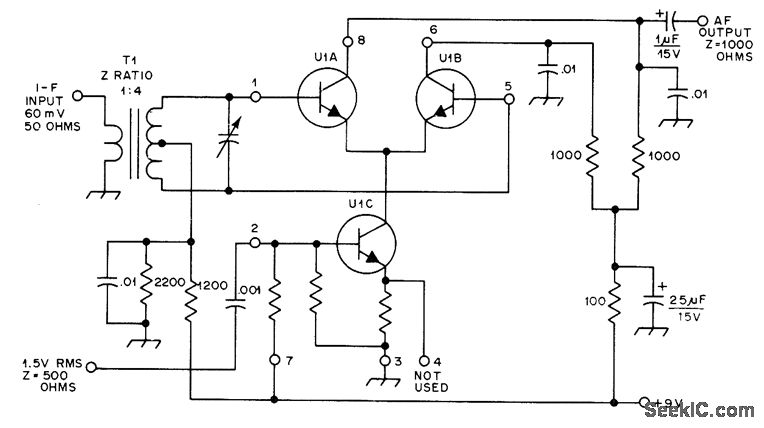 Uses RCA CA3028A differential amplifier U1 to provide conversion gain of about 18 dB for commonly used IF values. Values of tuned circuits depend on frequency used. Unmarked resistors are on IC.-D. DeMaw, Understanding Linear ICs, QST, Feb. 1977, p 19-23.
