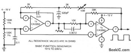 This function generator uses a CA3260 BiMOS Op amp to petform both the integrator and switchingfunctions.A 620-pF capacitor and 2-KΩ resistor shape feedback square wave to reduce spikes. Full audiospectrum, 10 Hz to 20 kHz,is covered with a single 10 Ω potentiometer. Requires 9-V battery.