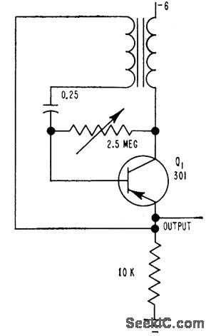 Generates relatively narrow pulses at adjustable repetition rate. Audio transformer provides positive feedback.-H. L. Armstrong, Transistorized Trigger and Delay Generators, Electronics, 313, p 96-98.