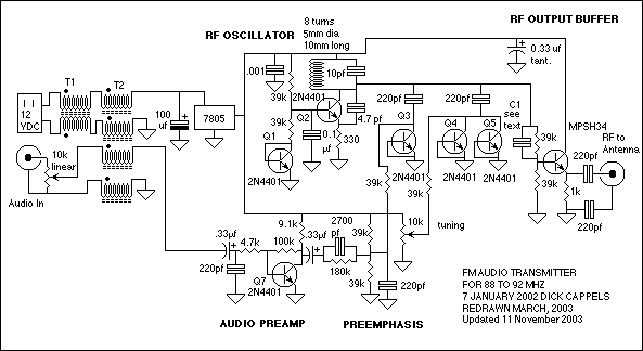 Here's a nice AC mains powered FM Broadcast Audio Transmitter with pre-emphasis, audio level control, and tuning control. The circuit consists of a frequency modulated oscillator, an audio preamplifier with pre emphasis to supply the frequency modulating signal, and a buffer amplifier to drive the antenna connector. Oscillator's frequency is determined by L1 resonating with the 10 pf capacitor and the total capacitance across it. The collector-base capacitance of the transistors Q3, Q4, and Q5 is a function of their revers bias. This is basically a poor man's (or lazy man's) varactor. The voltage across Q3 is set by a voltage divider and is then modulated by an Ac coupled audio signal from the pre amp, causing the reverse bias to vary with the audio signal, which changes the resonant frequency of L1's circuit, causing the frequency of the oscillator to vary with the audio signal. The capacitance of Q4 and Q5 is adjusted by DC bias from the tuning adjustment potentiometer, and this capacitance sets the center frequency of the oscillator. All of the transistors in the oscillator -Q1 through Q5, are 2N4401. The purpose of the buffer is to minimize frequency shift as loading on the antenna is changed. It was specifically designed to reduce the signal amplitude to the antenna. Transmitters should not use any more power than is necessary to achieve the task at hand, and lightly coupling the RF into the buffer's base with a gimmick capacitor did the trick. The transistor is an MPSH34.