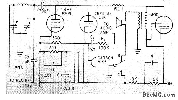 With switch in transmit position, carbon mike gets some of r-f amplifier current, and audio signals in last audio stage Heising-modulate transmitter. During reception, receiver local oscillator gets plate voltage, loudspeaker is connected, and cathodes of transmitter cry still oscillator and r-f amplifier are made positive to cut them off.-L. Solomon, Citizens Band Equipmenl Design, Electronics, 33:45, p 70-72.