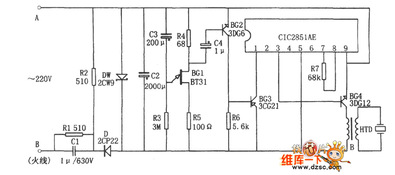 Rice cooker reactor circuit is shown in the figure. The circuit consists of 10-minute time delay circuit, 3V buck power supply, music integrated circuit CIC2851AE and piezoelectric ceramic HTD and so on. And the 10-minute delay circuit is mainly composited by BG1 R3 and C3. The 3V buck power supply mainly consist C1, R1, R2, D, DW and C2. The points A and B are parallel connected to control switch of the rice cooker.
