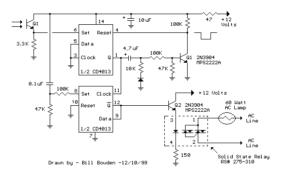 The circuit below is similar to the one above but can be used with a laser pointer to toggle the relay rather than a push button. The IR photo transistor Q1 (Radio Shack 276-145A) or similar is connected to the set input (pin 6). The photo transistor should be shielded from direct light so that the voltage at the set input (pin 6) is less than 1 volt under ambient conditions and moves to more than 10 volts when illuminated by the laser pointer or other light source. The reset time is about a half second using a 4.7uF cap which prevents the circuit from toggling more than once during a half second interval. The 10K resistor and diode provide a faster discharge path for the 4.7uF cap so the circuit can be retoggled in less than 1 second. The 3K resistor in series with the photo transistor may need be adjusted for best performance. The relay shown is a solid state variety to be used with lights or other resistive loads at less than 3 amps. A mechanical relay can also be used as shown in circuit above.