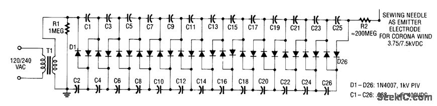 This 25-stage voltage doubler will generate corona wind. 120 Vac, or 3.75 kVdc when powered from 240 Vac.or 7.5 kvdc when powered 240 Vac