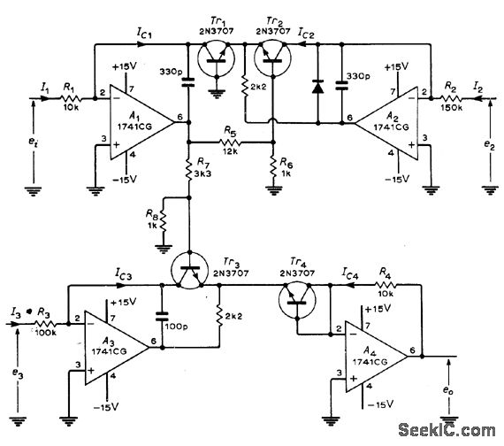 Combin ation of temperature-compensated opamp log converter and antilog converter generates output signal eo proportional to cube of input signal ei. Article gives design equations.-G. B Clayton, Experiments with Operational Amplifiers, Wireless World, Feb. 1973, p 91-93.