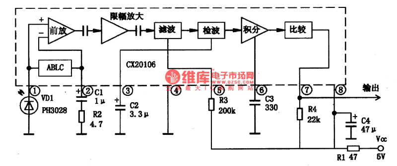 CX2O106A is an infrared tracking and control reception integrated circuit produced by Sony, Japan, which is widely used in the video, audio, air-conditioning, fan and so on as the remote signal reception circuit.1.pin functions and dataCX2O106A contains the remote signal reception, bandpass filtering, aftermath and other circuits. This IC is in 8-pin package, whose pin functions and data are listed in table 1.