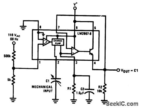 Fig. 14-19 This circuit uses an LM2907 to condition the output of a capacitive transducer, and to mix this output with another variable. If the other signal is fixed at 60-Hz, as shown, then the output is proportional to the capacitive-transducer output only. If the other signal is variable, the transducer acts as a multiplier. For example, in flow-measurement indicators, the input frequency can be a variable that depends on flow rate, such as a signal generated from a paddle wheel, propeller, etc. The capacitive-transducer can be an indication of orifice size or aperture size (such as a throttle). The product of these two indicates volume flow, where the output voltage is proportional to size times rate. A thermistor can be added to R1 to convert the volume flow to mass flow. A combination of these signal-conditioned inputs, including control voltage on the supply, can be used to provide complex analog functions, where several variable or fixed factors must be multiplied. National Semiconductor Linear Applications Handbook, 1991. p. 432.