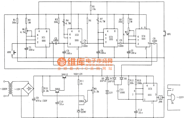 As shown in the figure is a class bell automatic controller circuit. It includes a step-down rectifier circuit, a circular program timing circuit, and an executive control circuit etc. IC4~ IC1 are trigger delay circuit, and the delay time can be adjusted by regulating charge-discharge time RC. IC5 is ringing time timing control circuit, and the delay time td5 is 1.1 R13C12. The output of IC4 IC1 in the circular program timing circuit is sent to D1, D2, then goes through capacitor C11 to trigger IC5 to output high level (feetâ‘¢),which would make the relay actuate, thus supply the bell DLwith power.