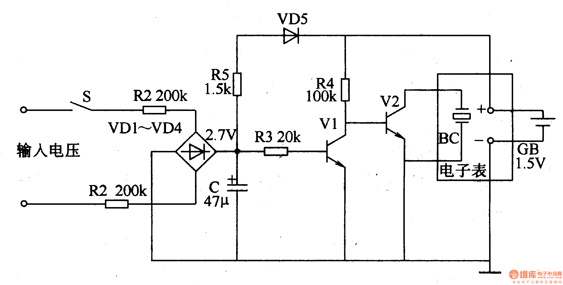 Turn on the power switch of the electronic instrument and the 220V voltage is limited by R1 and R2 and rectified by VD1-VD4. It produces 2.07V DC voltage on C. The timing begins. When the power switch of the electronic instrument is turned off, the voltage on C disappears. The frequency division circuit stops vibrating. But the frequency division circuit remains in the condition. When you turn on S next time, it begins to time again.