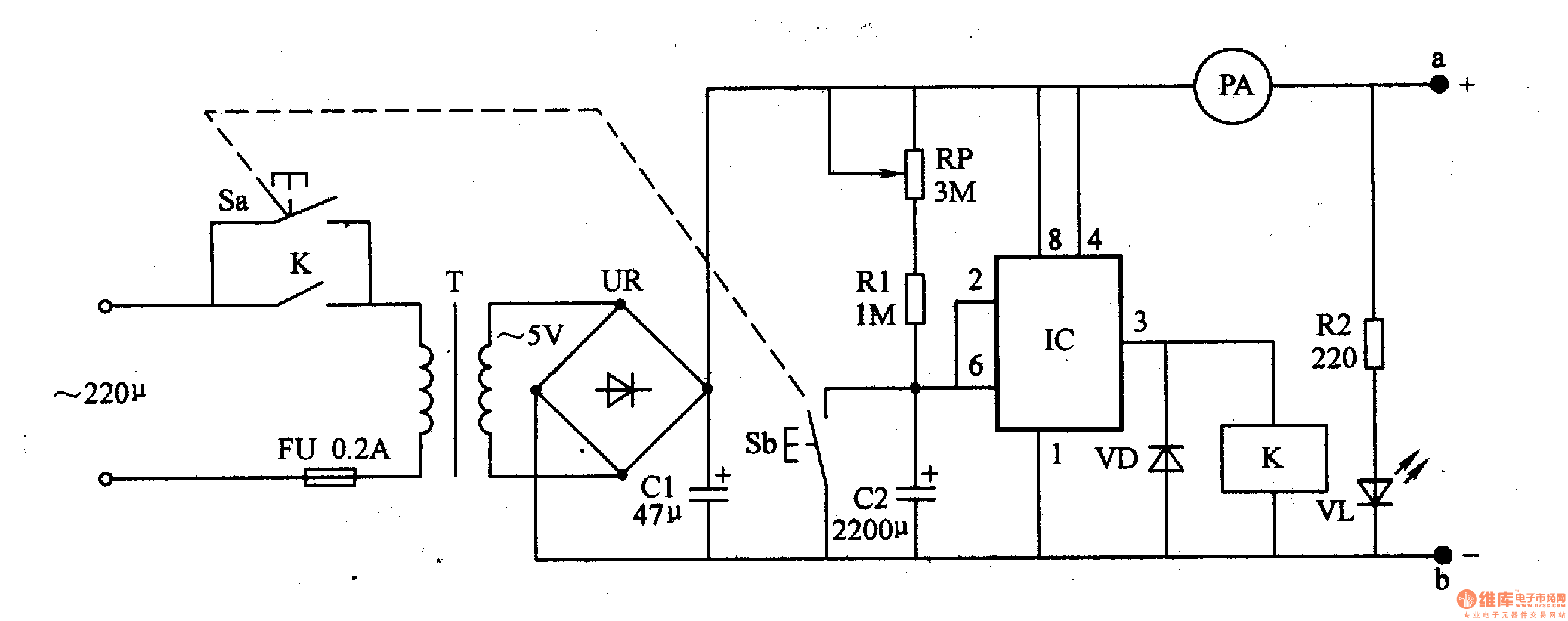 When you press button s 220V AC voltage will produce 5V DC voltage after being reduced, rectified and filtered by T, UR and CI. The voltage will separate into three parts. One is supplied to pole a, b and one lightens VL while another works as power of timing control circuit. If you increase the distance between pole a and pole b, the working current will decrease.