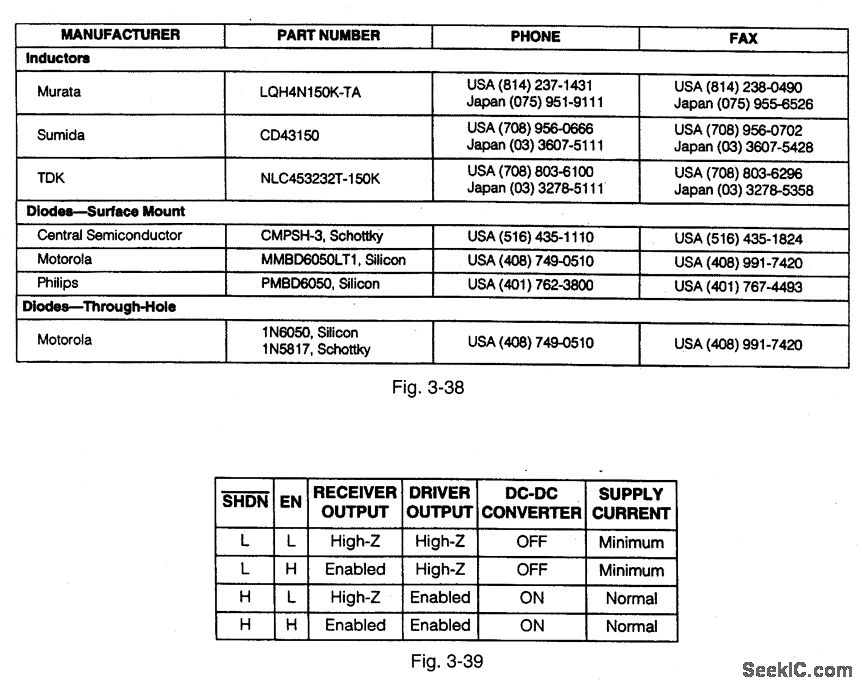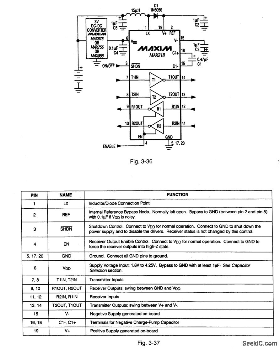 Figure 3-35 shows a typical application circuit for single-supply operation of the MAX218. Figure 3-36 shows the connections for operation from unregulated and regulated supplies. Figure 3-37 shows the pin descriptions. Figure 3-38 shows suggested component suppliers. This IC runs on two alkaline (NiCd or NiMH) cells to provide full EIA/TIA-232E and V.28/V.24 communications interface. True RS-232 and EIA/TIA-562 voltage levels are maintained with a wide +1.8-V to +4.25-V operating range. A shutdown mode reduces current to 1μA. The receivers can be enabled or disabled under logic control. Figure 3-39 shows the shutdown and enable/disable mode logic. The data rate is guaranteed at 120 kbps. MAXIM NEW RELEASES DATA BOOK, 1995, P. 2-79, 2-80, 2-81, 2-82.