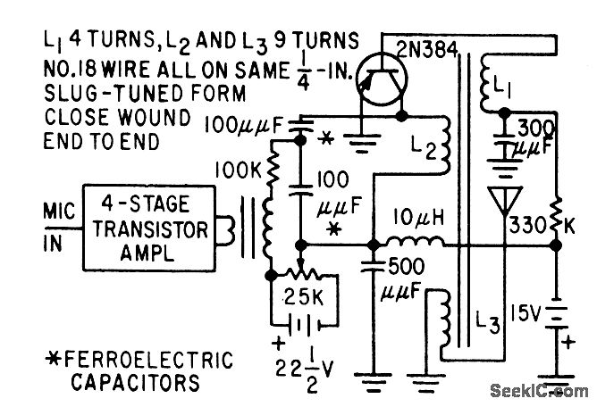 Used two voltage-tunable ferroelectric capacitors. Can be built in pocket-size plastic case when powered with hearing-aid batteries.-T. W. Butler, Jr., Ferroelectrics Tune Electronics, Circuits, Electronics, 32:3, p 52-55.