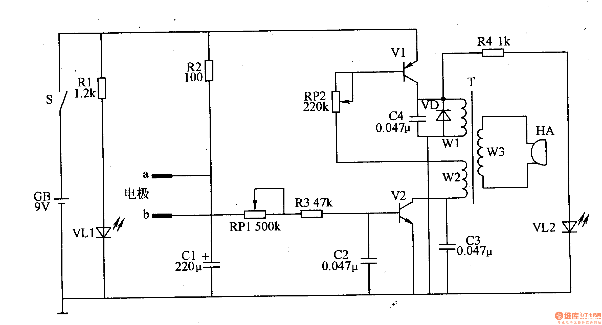 Turn on the switch S. put one pole in the tester’s hand. And use the other one to probe the acupoint near the ears. The 9V voltage of GB makes the OSC work. It also drives HA to make sound. If the electric resistance of the acupoint is small, the frequency of the OSC is higher. The tone of the sound which is made by HA is higher. It works on the other way.