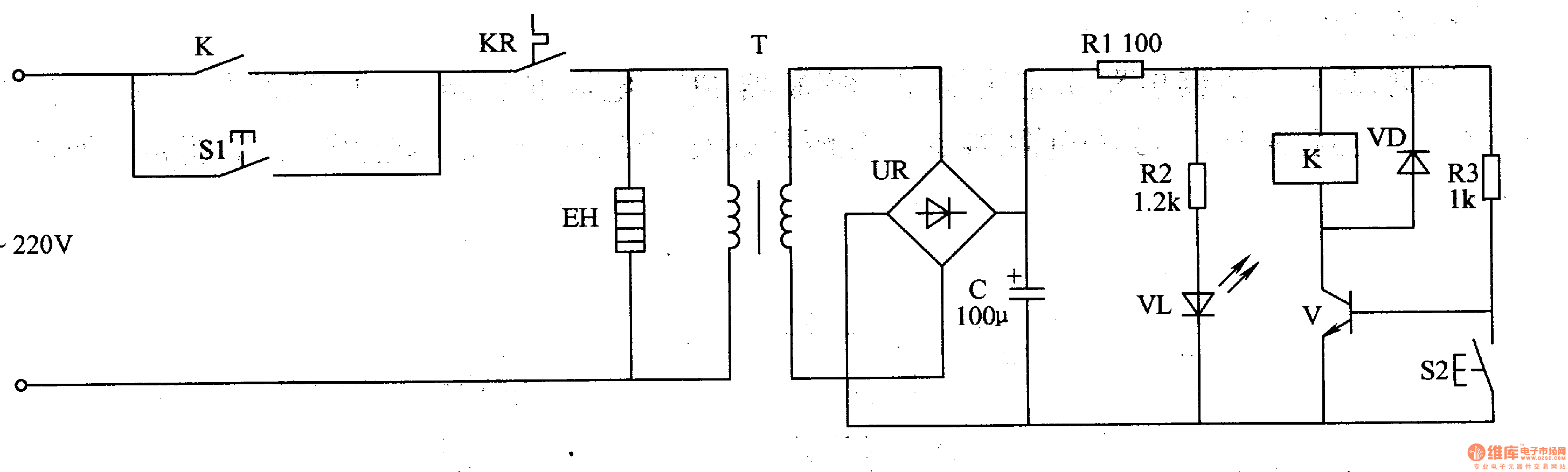 The electronic sterilizer circuit consists of power circuit, control circuit. (It is showed in picture 9-96.)Process circuit and press SI. 220V AC voltage supplies 12V direct-current working voltage after being reduced, rectified, filtered, bucked and limited by T, UR, C and RI. The voltage makes V conducted and lightens VL in the meantime. If you want to stop heating in the process of heating and sterilizing you can press S2 and cut off the machine’s power.