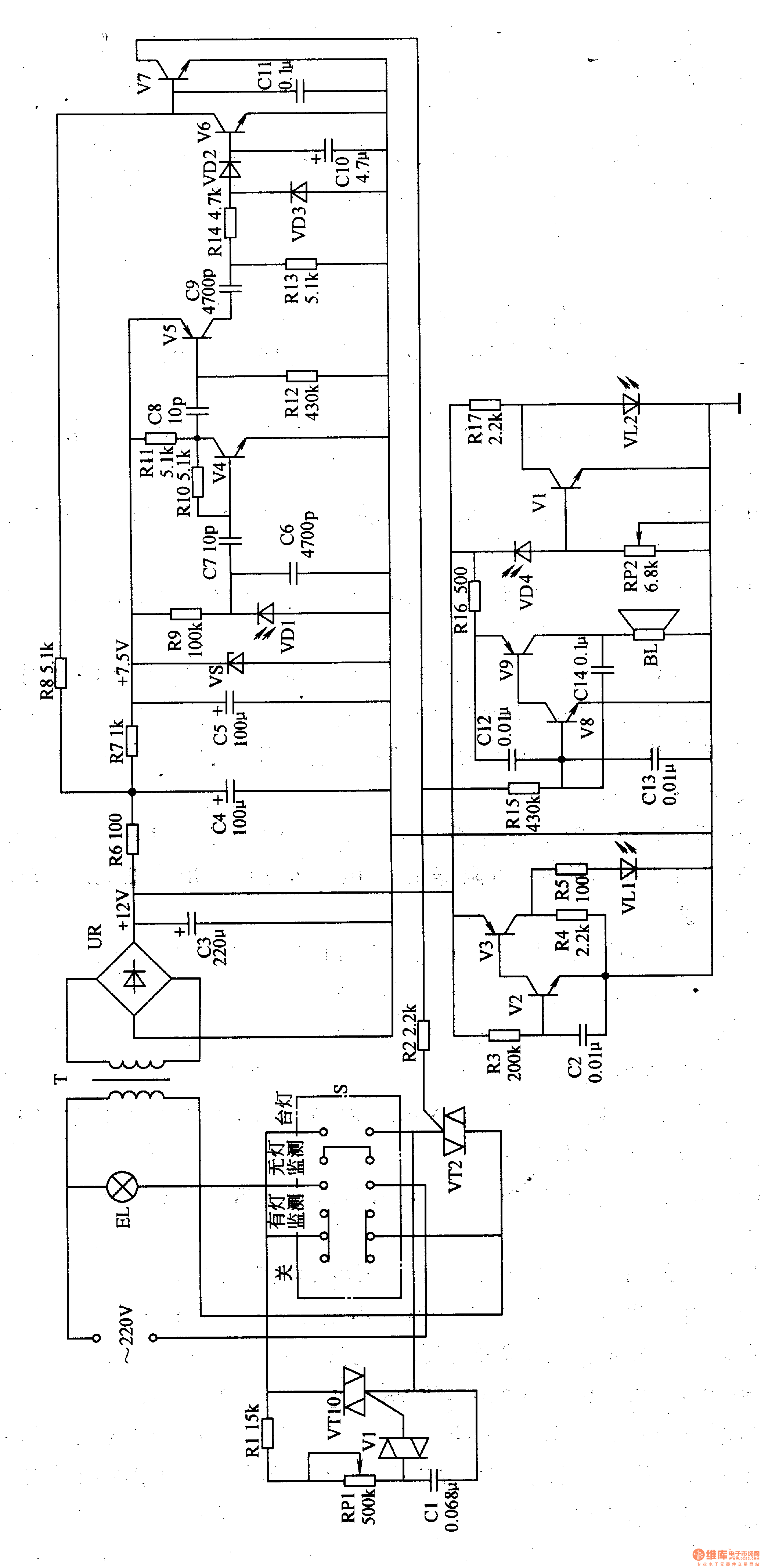 The circuit consists of power circuit, infrared radiation circuit, infrared reception and amplifying circuit, rectifying circuit, electric switch circuit , function control circuit and so on (It is showed in picture 9-73.).
