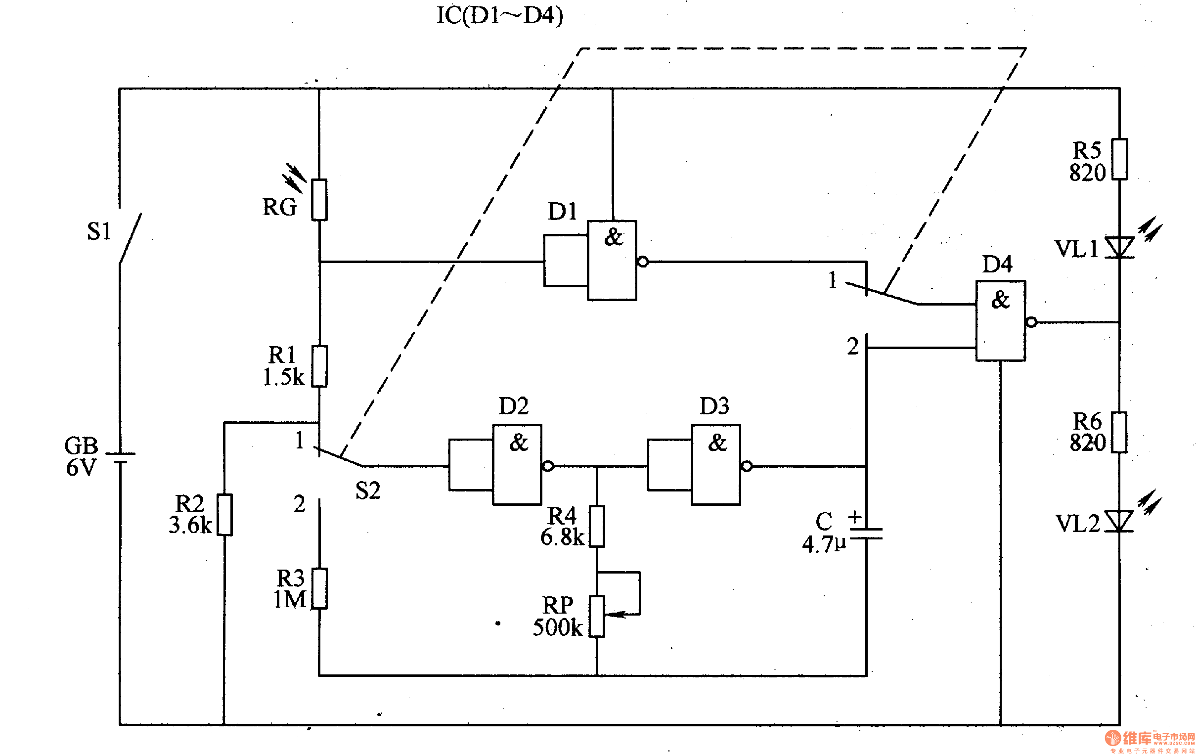 When the environmental light is too dim the value of RC is large. Here the red shining diode VL1 is lightened to remind the user to flip on the lamp. When the environmental light is suitable for reading and writing the value of RG is small. Here green shining diode VL2 is lightened. If the environmental light is too strong VL1 is lightened.
