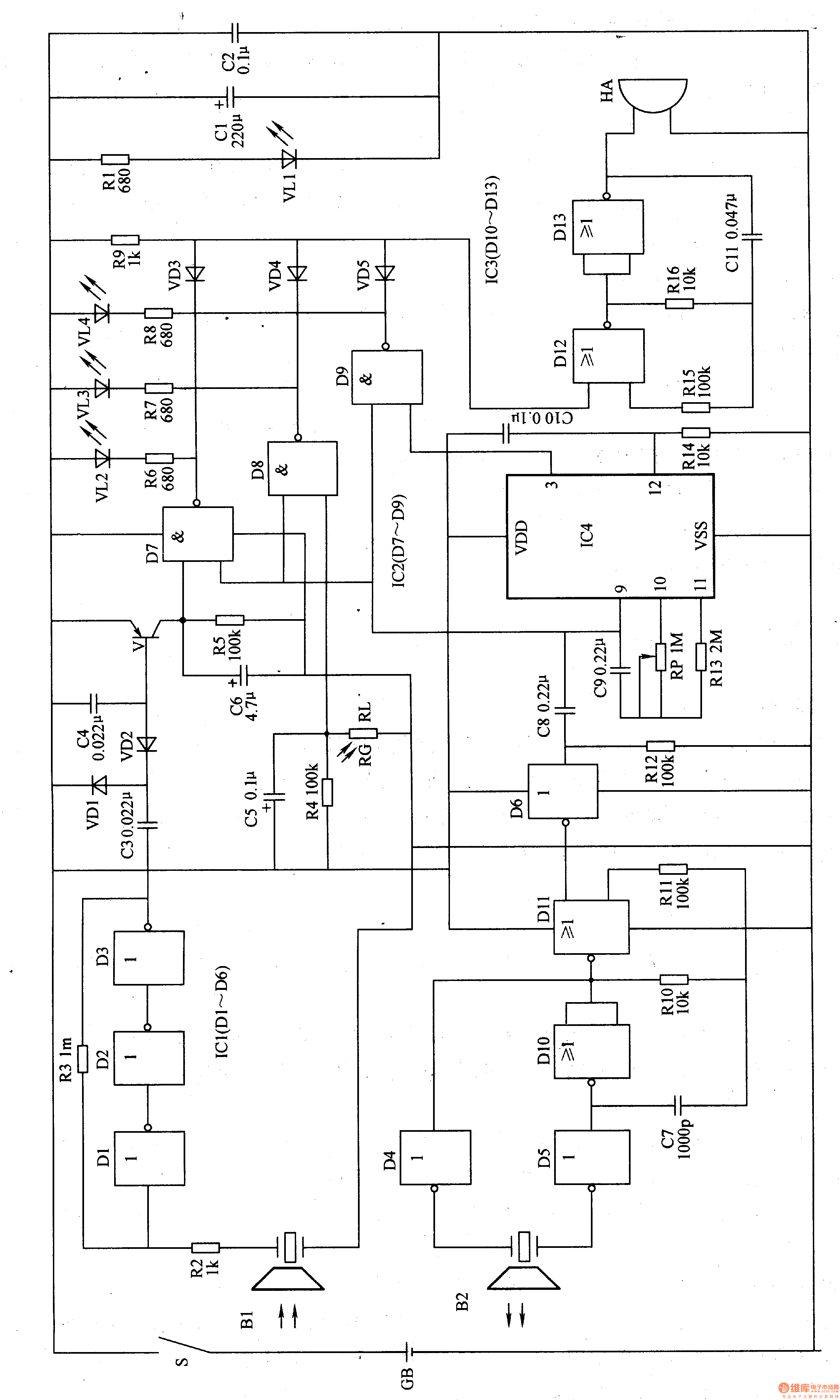 Turn on power switch and the circuit starts to work. When the user’s head is too near from the writing pad (the distance is less than 35cm) VL2 shines and HA makes the sound “tick tick” to alarm the user. When the environmental light is strong enough the voltage of VD is not so high. Here VL does not shine and HA makes no sound. When the environment light is dim the voltage of VD is high. Here VL shines and HA makes sound to remind the user to flip on the lamp. When the regular time is over VL3 is lightened and the HA makes sound to remind the user to have a rest.