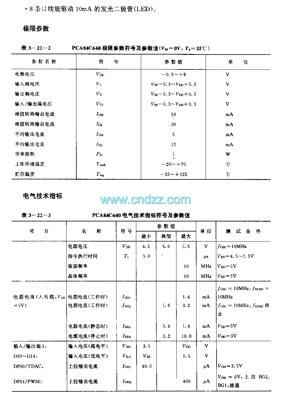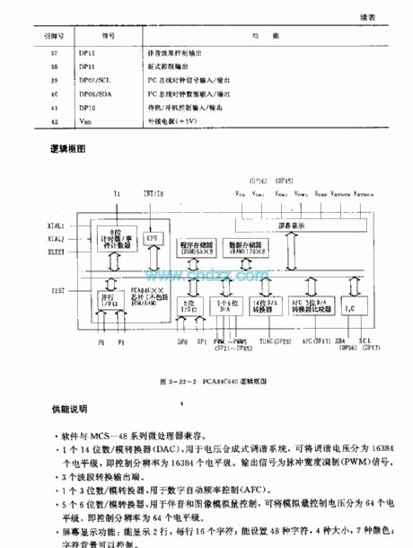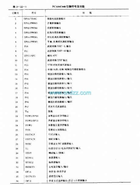 PCA84C640 is a special microprocessor applied to TV remote control system. Internal circuit consists of 8-bit counter/event counter, 8-bit central processing unit(CPU), 6k byte mask program memory(ROM), 128 byte data memory, multi-user bus line interface, 1 outside interrupt line, I2C bus line, 1 direct test line, 18 universal two-way I/O line and 11 two-function I/O line, screen display circuit, voltage synthesis tune system 14-bit PWM(DAC) and AFC input ADC and D/A converter etc.