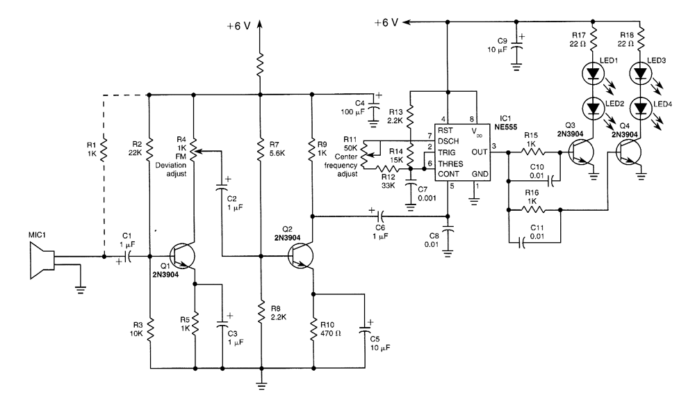 This transmitter uses two-stage amplifier Q1/Q2 to frequency modulate an NE555 (configured as a VCO) operating at about 50 kHz. The resultant FM-modulated pulse train is converted to light pulses via LED1 through LED4, driven by Q3 and Q4.