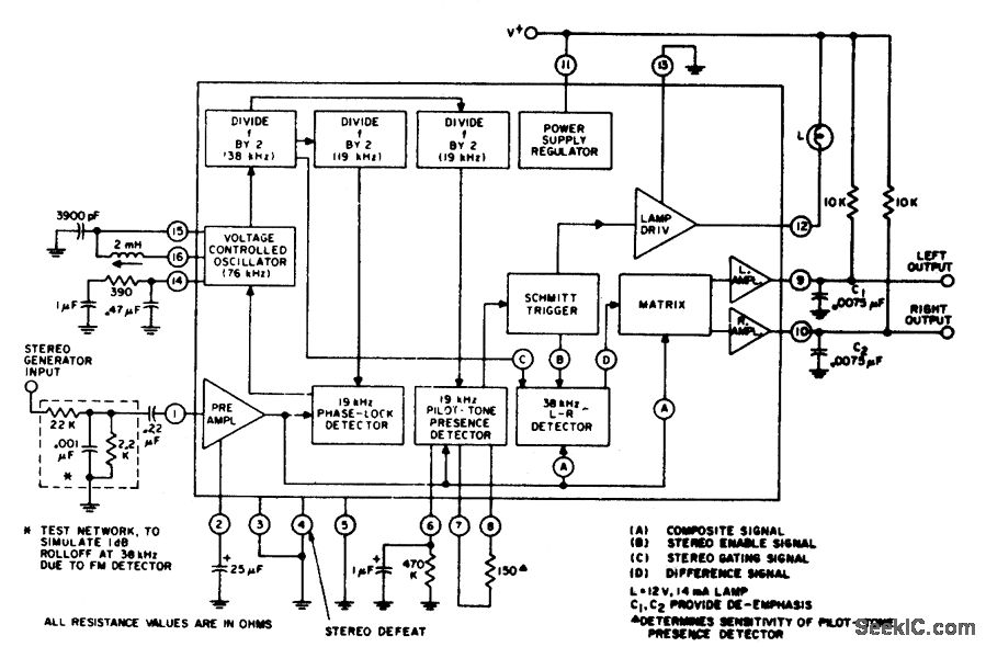 FM stereo multiplex decoder using an ECG789 16-pin QIP. Typical supply voltage is 12 volts; however, the ECG789 can operate over a wide variation of supply voltage up to 16 volts. The internal lamp driver can be made to drive a lamp of hjgher power than the 14 mA one shown by controlling an external NPN or PNP transistor. To drive PNP type, pin 13 is grounded and pin 12 is connected to the base. To drive an NPN type, pin 12 is connected to supply and pin 13 is connected to the base (courtesy GTE Sylvania Incorporated).
