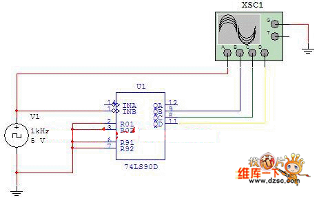 Figure: Five-divider frequency circuitWhen the counting pulse is input from the INB, the output would be QB, QC and QD. Such would form quinary counter (also called five-divider frequency circuit), whose circuit is just as shown in Figure 2-3. Use four-trace oscilloscope to record the output waveform.