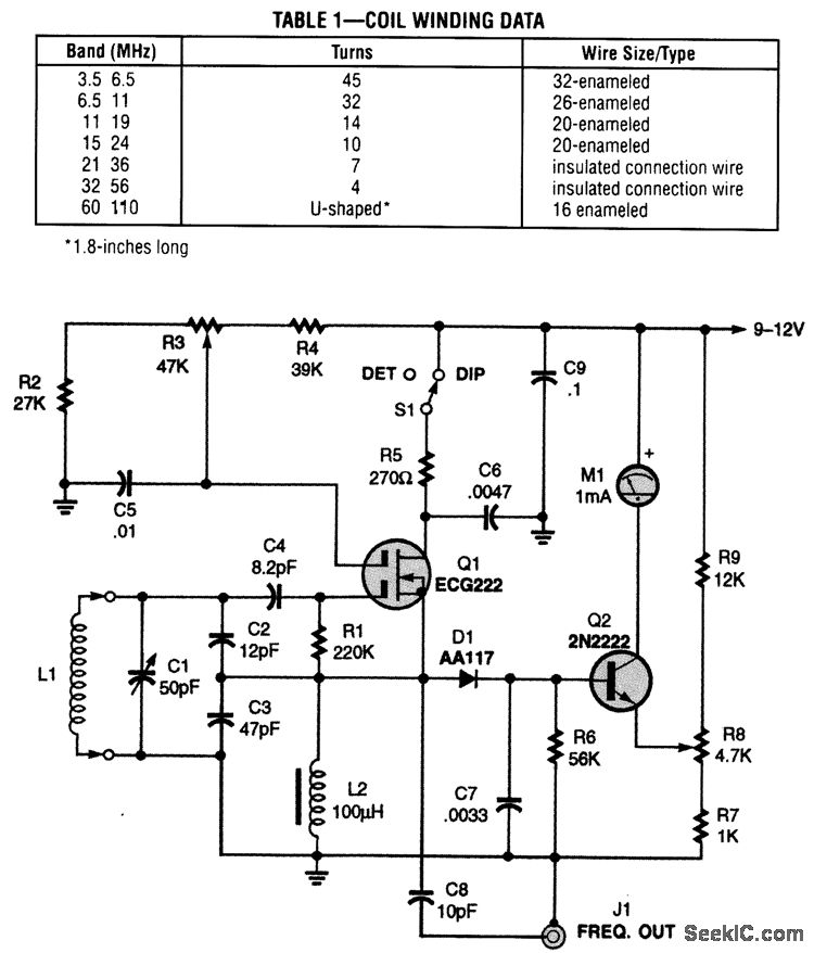 This dip oscillator, based on the classic vacuum-tube circuit, is very useful for checking tuned circuits and antennas, and is a valuable tool for the RF experimenter. Coil forms are 1/2-in diameter plastic tubing.
