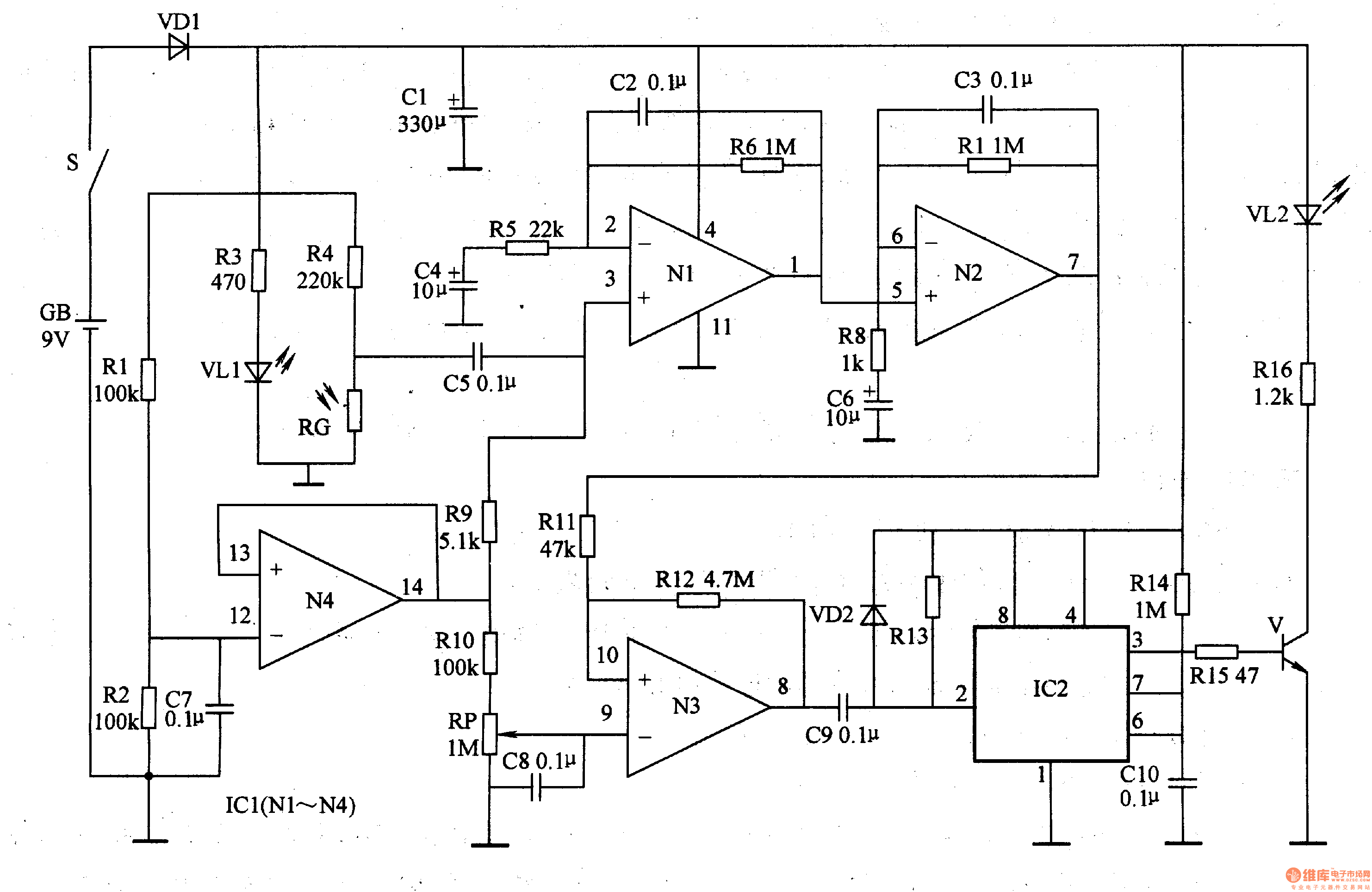 When you do the test, put your finger on the testing sensor. The sensor consists of VL1 and RG. RG tests the signal voltage of the blood runoff. The signal is transited to N3 through N1 and N2. It produces positive impulse and negative impulse. It makes V work intermittently. It makes VL2 shines. The shining rate is the heart rhythm.