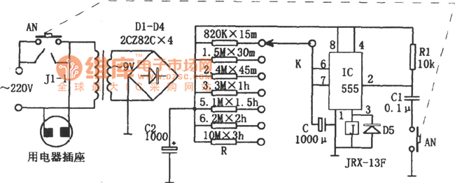 The timing circuit is a monostable delay circuit composed of IC (555) , R, C and some other components, and the timing time depends on the magnitude of charging and discharging time RC. When one stwiches on AN, 555 will start to set because the potential of feet ② is low level,and the high level output by feet③ will actuate relay J , so contacts J1-1 will be on to put the power through. At this time, timing starts and capacitor C will be charged through R. When the voltage of C is big enough to make the potential of feet⑥ of 555 higher than 2/3VDD, 555 will be reset,the low level output by feet③ will release relay J.so contacts J1-1 will cut off leading to appliance blackouts.The time for home appliance outages time can regulated by using K to choose different gears .