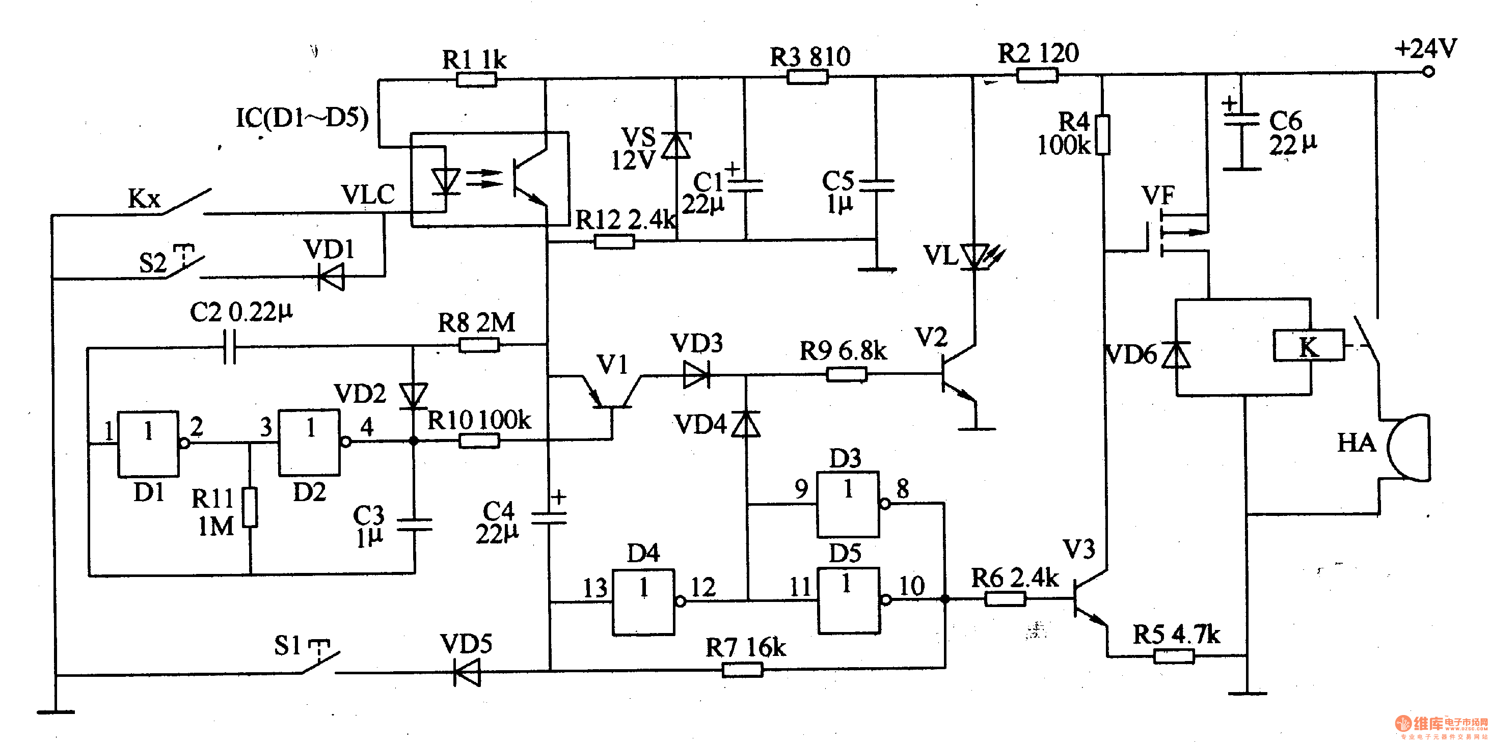 Work of the circuit The circuit consists of + l2V regulator circuit, the switching control circuit, oscillator, bistable trigger circuit and sound and light alarm. (It is showed in picture 8-120.)+ l2V regulator circuit consists of resistors R2, R3, filter capacitor Cl, C5, C6 and regulator diode VS.The switching control circuit consists of resistors Rl, Rl2, mix together goose control VLC and industrial instrumentation control contact (controlled by electrical contacts) Kx.Oscillator consists of NAND gate IC IC (Dl-D5) within the Dl, D2 and the diode VD2, resistors Rll, capacitors C2, C3.Bistable trigger circuit consists of D3-D5 within IC and resistor R7.Sound and light alarm consists of transistor Vl-V3, resistor R4-R6, Rg, RlO, light-emitting diodes VL, diodes VD3, VD4, VD6, field-effect transistors VF, K and alarm relay HA.