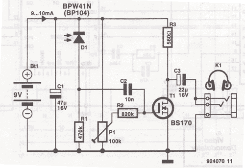 Use this infrared headphones receiver with the ir headphones transmitter.Use 600Ω headphones. BPW41N and BP104 have a filter for visible light and are centered on 950nm at 250C.At normal light illumination and 3 to 4 meters distance the audio distorsion were 1 – 2%, wich is not bad for such a simple ir headphones receiver schematic