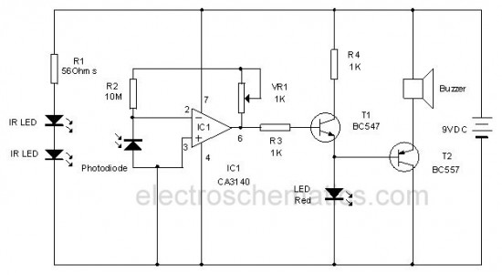 This circuit uses Invisible Infrared light to detect the movement of people through the door. A short beep will be generated when the infrared beam breaks. So it is ideal to monitor the passages in shops, banks etc where many people are moving.