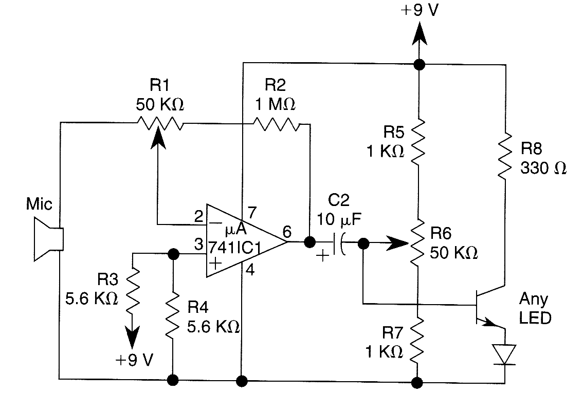 This transmitter uses a 741 op amp as a high-gain audio amplifier, which is driven by a rnicro-phone. The output of the 741 is coupled to Q1, which serves as the driver for a LED. Potentiometer RI is the amplifier's gain control. Miniature trimmer resistor R6 permits adjustment of the base bias of Ql for best transmitter performance. Gain control RI can be eliminated if C1 and R2 are con-nected directly to pin 2 of the 741. For maximum sensitivity, increase the value of R2 from 1 to 10MΩ and use a crystal microphone with a large diaphragm.