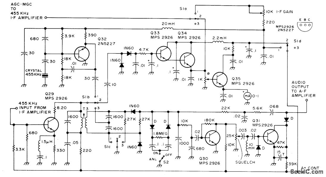 Used in all-band double-conversion superheterodyne receiver for AM, narrow-band FM, CW, and SSB operation. Q29 acts as limiter on FM but on AM is 455-kHz amplifier whose RF output is coupled to 1N60 AGC rectifier pair connected as voltage doubler that provides bias for AGC amplifier Q33-Q34. Output of Q29 is coupled to detector by T3. Although detector is actually phase discriminator, mode switch connects circuit as half-wave rectifier for AM and CW/SSB. On CW/SSB (S1 on 1), AGO rectifier is disconnected and AGC diodes receive bias from manual gain-control pot. BFO is then energized and connected to T3. Output of diode detector feeds squelch and audio stages. Supply is 13.6 V regulated. Article gives all circuits of receiver.-D. M. Eisenberg, Build This All-Band VHF Receiver, 73 Magazine, Jan.1975, p 105-112.