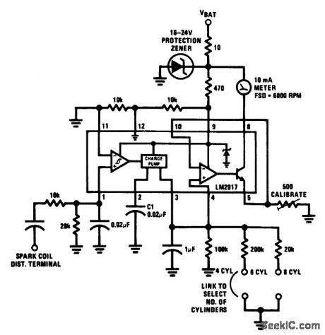 Fig. 14-18 This circuit uses an LM2907 to condition the signals between a gasoline engine and a tachometer. The simple circuit can be set for any number of cylinders by linking the appropriate timing resistor, as shown. The 500-Ω calibration pot is set so that 6000 rpm produces a full-scale indication on a 10-mA meter movement.the zener and resistor ale added as a safety precaution against transients. National Semicondutor Applications Handbook, 1991. p 429 .   (View)