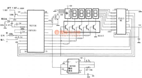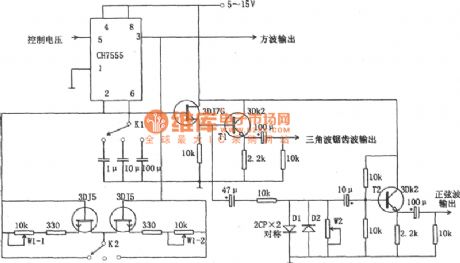 As the picture shows, it is a function generator circuit formed by 555 timer. This circuit is made up of a CH7555 timer, some transistors and RC components, which can generates triangle wave, square wave, sine wave, saw wave and swept wave. All kinds of wave have a adjustable frequency from 0.1 Hz to 100k Hz. The amplitude of vibration of square wave is from 5 V to 15 V which can drive TTL circuit. The accuracy of sine wave is higher than 3%.