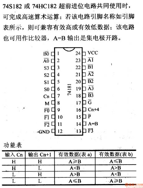 When the 74S182 or 74HC182 is used with the advanced carry circuit, it can complete the high-speed arithmetic; if this circuit's pin names are as shown in the pin table, it can compatible with the high or low effective data; this circuit can be used as the comparator, the A=B output is the collector electrode's open circuit.
