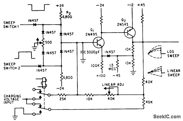 Resistance coupling in feed-back loop permits positive-going as well as negative-going waveforms. Circuit gives choice of logarithmic, exponential, or linear sweep output. Relay switches between linear and long sweep.-J. Curry and W. Sander, Bootstrap Generates Logarithmic Sweeps, Electronics, 33:52, p 60.