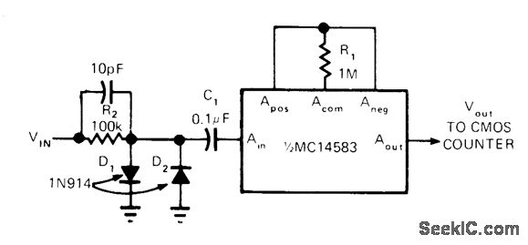 Simple CMOS linear front end for 5-MHz battery-operated counterreduces power drain and makes it proportional to input frequency,With no input,drain is only a few microamperes Half of COUNTER MC14583 CMOS Schmitt trigger forms front end operating from single 6-V battery used In counter,Upper frequency limit is about 3 MHz,and input sensitivity is 400 mV.-D Aldridge,CMOS Counter Circuitry,Slashes Battery Power Requirements,EDN Magazine,Oct,20,1974,p 65-71.