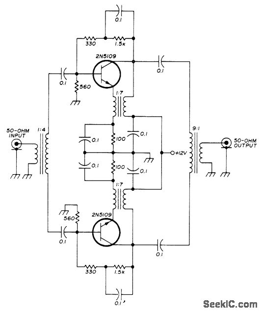Low-noise version of transistorized push-pull RF stage uses emitter feedback through transformer to give extremely high input and output impedances. Noise figure is below 2 dB. Developed for use in high-quality communication receiver.- U. L. Rohde, Optimum Design for High-Frequency Communications Receivers, Ham Radio, Oct. 1976, p 10-25.