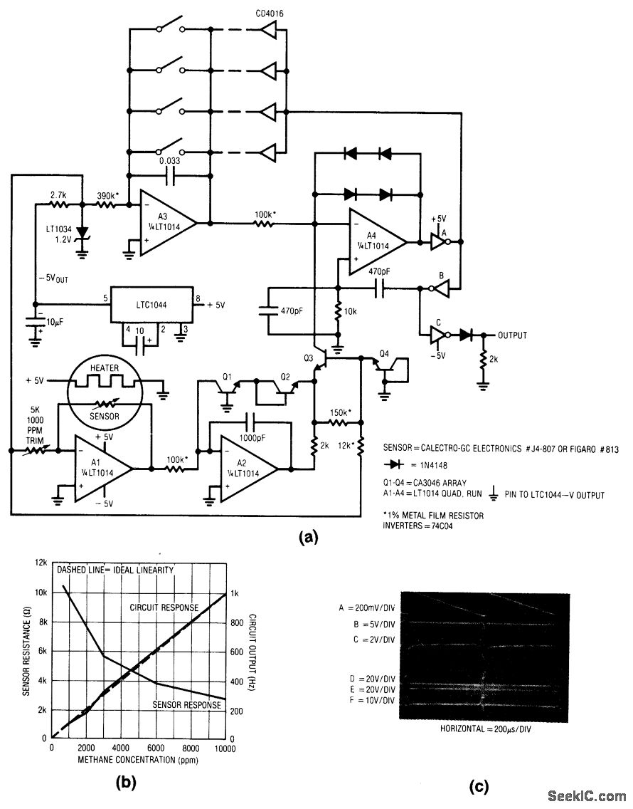 Fig. 14-5 The frequency output of this circuit is directly proportional to the methane concentration detected by the transducer. Figure 14-5B shows the transducer versus circuit response. To calibrate, place the transducer (sensor) in a 1000-pprn methane environment, and adjust the 1000-ppm trim for a 100-Hz output. Accuracy from 500 to 10,000 ppm is limited by the sensor 10% specification. Linear Technology, Linear Applications Handbook 1990. p AN11-3.