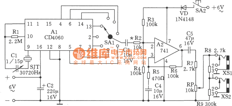 Low frequency signal generator can be used to measure the sensitivity, frequency response, frequency compensation and tone control of amplifier circuit. It also can be used to repair low frequency amplifiers. So it is a very useful measuring instrument. It also can be used as signal source of digital clock. According to the practical needs, the user can choose from 8 fixed frequencies output by the signal generator. The output amplitude is divided into two gears: 0 ~ 0.1 V, 0 ~ 1 V which can be adjusted continuously. Principle of the circuit is as shown in the figure. Integrated circuit CD4060 is a 14-level frequency divider installed with oscillator.
