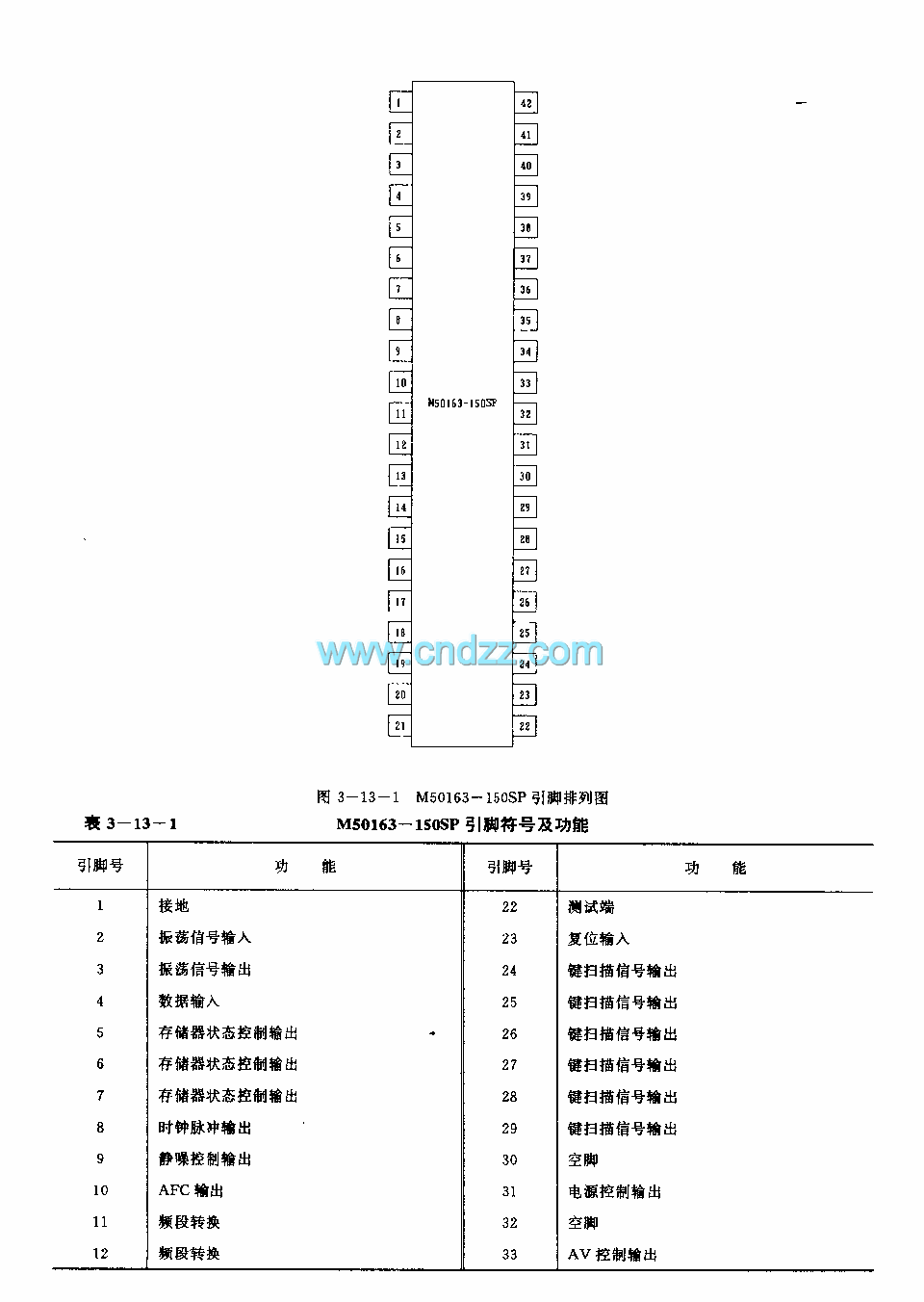 M50163-150SP is an infrared remote control receiving microprocessor which is applied to TV etc. Internal circuit consists of CPU, key scan output circuit, key scan input circuit, TV/VTR converter circuit, chip select circuit, AFC circuit, frequency band control circuit, oscillator, storage control circuit, lightness digital/mimic converter circuit, source switch control circuit and video AV control remote signal processing circuit. Related used type is CX20106A. Package model is 20-pin dual-in-line plastic package.