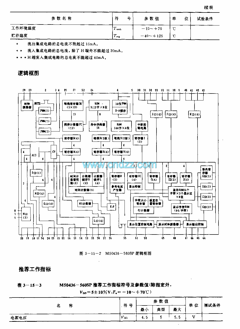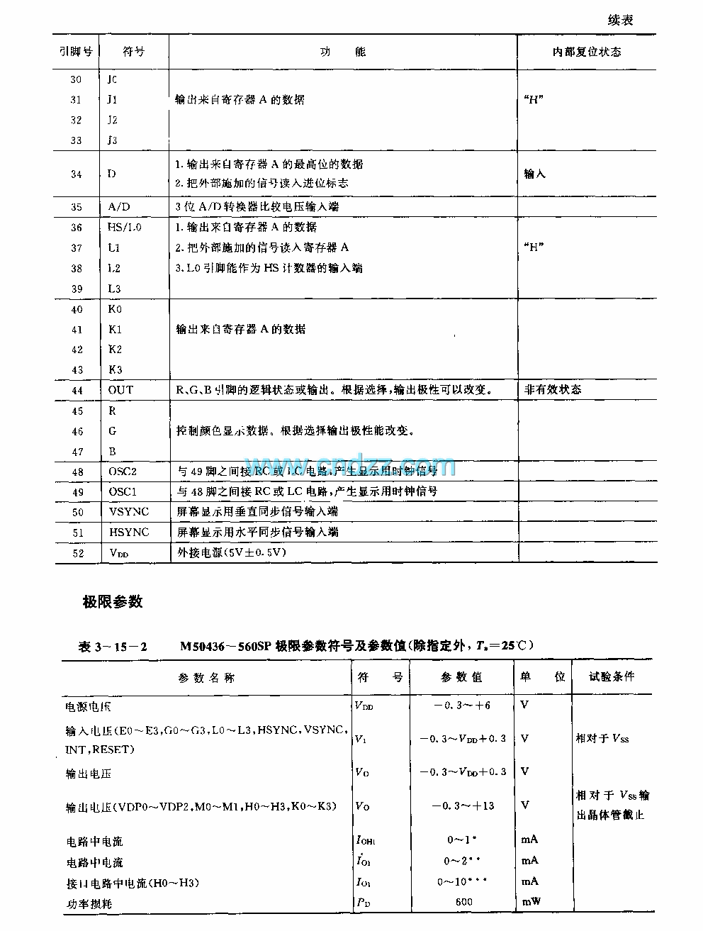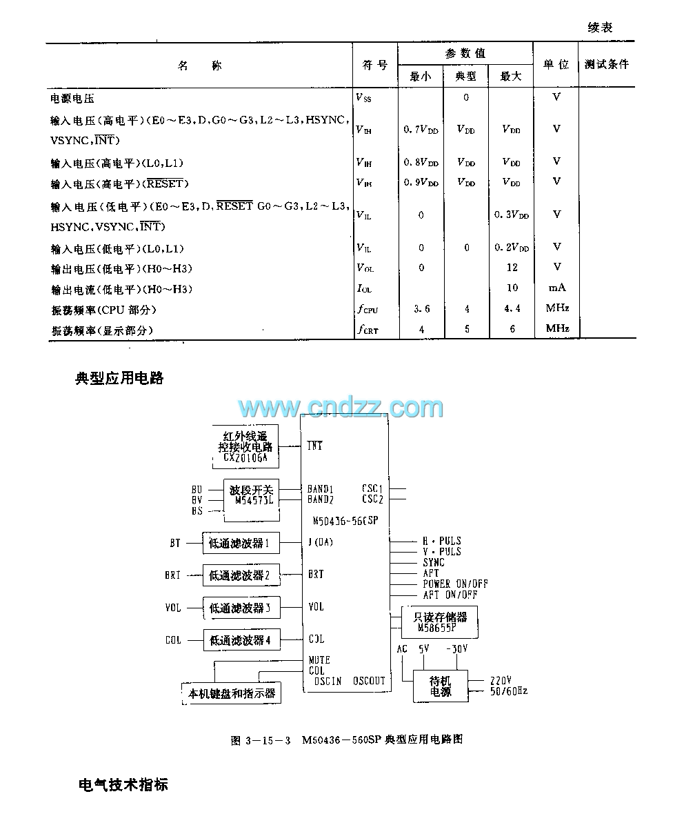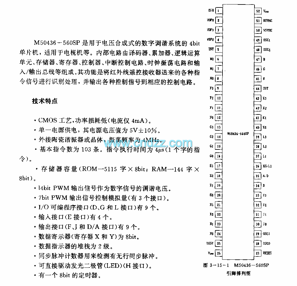 M50436-560SP are 4bit singlechips used in voltage synthesized digit tune system, applied to TV etc. Internal circuit consists of encoder, accumulator, logic operation unit, storage, register, controller, cut-off control circuit, clock oscillating circuit and input/output bus line etc. Identifing different instruction signals sentfrom infrared remote control receiver, then the circuit outputs control signals to control circuit.
