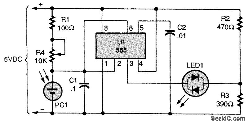 The circuit is based on a 555 timer IC, U1, and operates on 5-Vdc to make it usable with digital logic. The operating power of the circuit can be converted to 12 V by increasing the values of R2 and R3. Train detection is accomplished by photocell PC1, which should be mounted between the rails, flush with or slightly below the ties. A small light must be mounted directly above PC1 when it is used in a dark area. Resistor R4 is adjusted so that when a train covers PC1, the circuit triggers. Resistor R1 reduces the current to U1 if R4 is set for minimum resistance. Variable resistor R4 can also be ad-justed so that each individual car in a train will change the colors of LED1, a bicolor unit, back and forth, indicating train movement. That can be handy if two circuits are used, one at each end of the track block. It will indicate that the train has begun to move, Mount LED1 on the control panel. The circuit is designed to indicate a green when no train is present. When a train covers PC1, U1 switches LED1 to red, indicating that the train is in position.