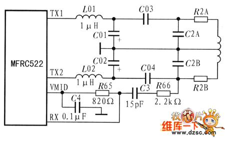 Internal receiver circuit works rely on the responding signals of card having modulation function on the bilateral area of sub-carrier. VMID signal produced by the internal circuit of MFRC522 is used as the bias of RX pin input signal. It needs to connect a capacitor C4 between VMID and GND for stabilizing VMID output. Receiver circuit needs to be connected a voltage divider circuit between the RX and VMID. The matching circuit and the signal receiving circuit is shown as the chart. The figure includes EMC low pass filter (L01, L02, C01, C02), receiver circuit (R66, C3, R65, C4), antenna matching circuit (C03, C04 , C2A, C2B, R2A, R2B) and antenna.