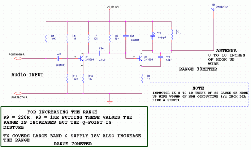 This is a medium range transmitter circuit diagram. This is also improved by changing the values of the resistor.